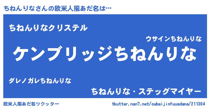 | 男性向けラノベタイトル風あだ名 | 『Re:ちねんりなから始める異世界生活』 |