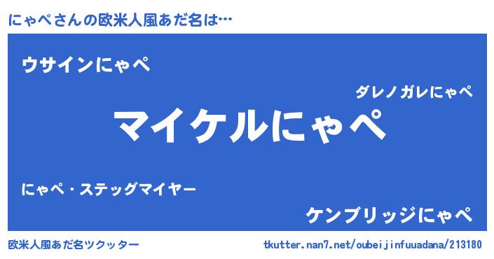 | 男性向けラノベタイトル風あだ名 | 『にゃぺの憂鬱』『魔弾の王とにゃぺ』 |