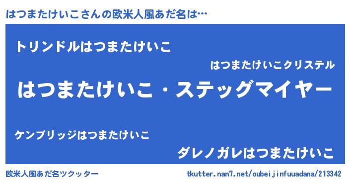| 男性向けラノベタイトル風あだ名 | 『うちのはつまたけいこが世界を掌握している!』 |