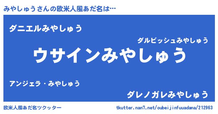 | 男性向けラノベタイトル風あだ名 | 『みやしゅうの嫁は女の子じゃないと思った?』 |