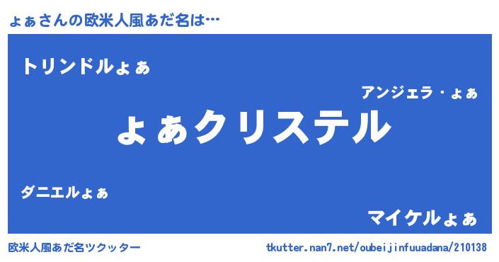 | 自動車の名前っぽいあだ名 | 『ョクア』『ョールスァイス』『ョンR』 |