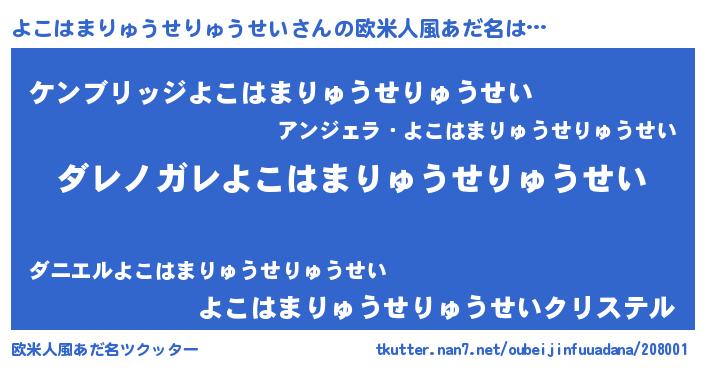 | 女子向けラノベタイトル風あだ名 | 『よこはまりゅうせりゅうせいが死なない童話 林檎のよこはまりゅうせりゅうせいの診療簿』 |