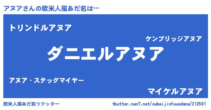 | ヘコむあだ名 | 『アヌにゅー』『豆乳』『アヌア(笑)』 |