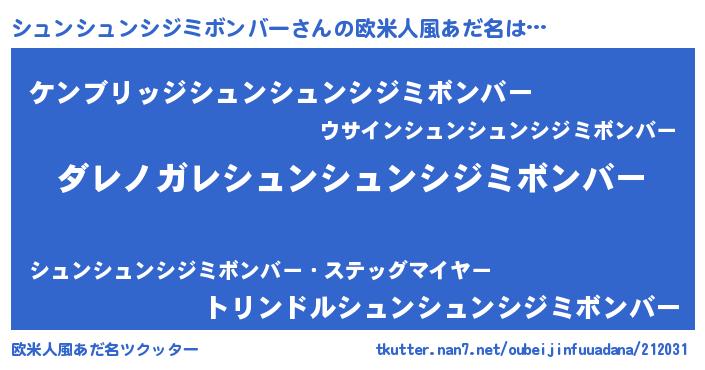 | 女子向けラノベタイトル風あだ名 | 『シュンシュンシジミボンバーが死なない童話 林檎のシュンシュンシジミボンバーの診療簿』 |