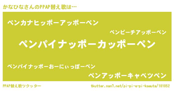 かなひなさんのPPAP替え歌は… 『ペンパイナッポーカッポーペン』『ペンカナヒッポーアッポーペン』『ペンアッポーキャベツペン』 ツクッター #PPAP替え歌ツクッター http://tkutter.nan7.net/pi-pi-e-pi-kaeuta/101052/