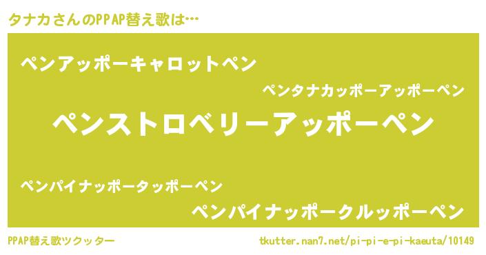 タナカさんのPPAP替え歌は… 『ペンストロベリーアッポーペン』『ペンアッポーキャロットペン』『ペンパイナッポークルッポーペン』 ツクッター #PPAP替え歌ツクッター http://tkutter.nan7.net/pi-pi-e-pi-kaeuta/10149/