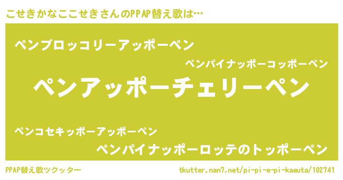 こせきかなここせきさんのPPAP替え歌は… 『ペンアッポーチェリーペン』『ペンブロッコリーアッポーペン』『ペンパイナッポーロッテのトッポーペン』 ツクッター #PPAP替え歌ツクッター http://tkutter.nan7.net/pi-pi-e-pi-kaeuta/102741/