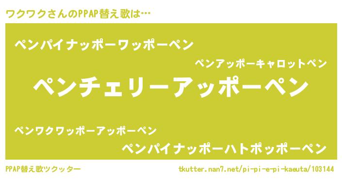 ワクワクさんのPPAP替え歌は… 『ペンチェリーアッポーペン』『ペンパイナッポーワッポーペン』『ペンパイナッポーハトポッポーペン』 ツクッター #PPAP替え歌ツクッター http://tkutter.nan7.net/pi-pi-e-pi-kaeuta/103144/