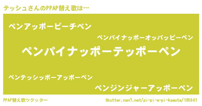 テッシュさんのPPAP替え歌は… 『ペンパイナッポーテッポーペン』『ペンアッポーピーチペン』『ペンジンジャーアッポーペン』 ツクッター #PPAP替え歌ツクッター http://tkutter.nan7.net/pi-pi-e-pi-kaeuta/105641/