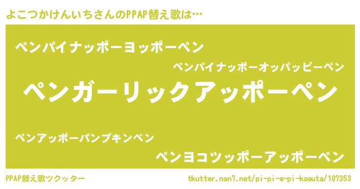 よこつかけんいちさんのPPAP替え歌は… 『ペンガーリックアッポーペン』『ペンパイナッポーヨッポーペン』『ペンヨコツッポーアッポーペン』 ツクッター #PPAP替え歌ツクッター http://tkutter.nan7.net/pi-pi-e-pi-kaeuta/107353/