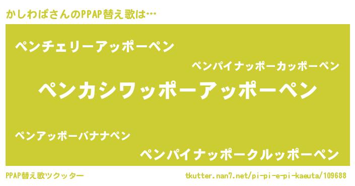 かしわばさんのPPAP替え歌は… 『ペンカシワッポーアッポーペン』『ペンチェリーアッポーペン』『ペンパイナッポークルッポーペン』 ツクッター #PPAP替え歌ツクッター http://tkutter.nan7.net/pi-pi-e-pi-kaeuta/109688/