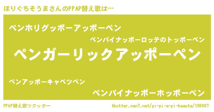 ほりぐちそうまさんのPPAP替え歌は… 『ペンガーリックアッポーペン』『ペンホリグッポーアッポーペン』『ペンパイナッポーホッポーペン』 ツクッター #PPAP替え歌ツクッター http://tkutter.nan7.net/pi-pi-e-pi-kaeuta/109907/