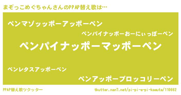 まぞっこめぐちゃんさんのPPAP替え歌は… 『ペンパイナッポーマッポーペン』『ペンマゾッッポーアッポーペン』『ペンアッポーブロッコリーペン』 ツクッター #PPAP替え歌ツクッター http://tkutter.nan7.net/pi-pi-e-pi-kaeuta/110662/