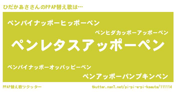 ひだかあささんのPPAP替え歌は… 『ペンレタスアッポーペン』『ペンパイナッポーヒッポーペン』『ペンアッポーパンプキンペン』 ツクッター #PPAP替え歌ツクッター http://tkutter.nan7.net/pi-pi-e-pi-kaeuta/111114/