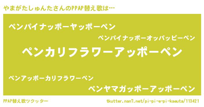 やまがたしゅんたさんのPPAP替え歌は… 『ペンカリフラワーアッポーペン』『ペンパイナッポーヤッポーペン』『ペンヤマガッポーアッポーペン』 ツクッター #PPAP替え歌ツクッター http://tkutter.nan7.net/pi-pi-e-pi-kaeuta/113421/