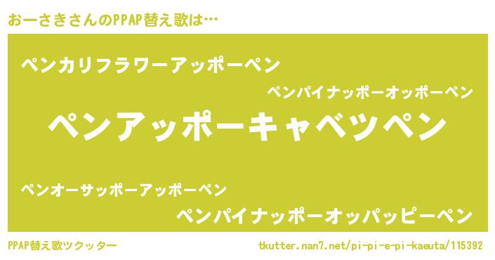 おーさきさんのPPAP替え歌は… 『ペンアッポーキャベツペン』『ペンカリフラワーアッポーペン』『ペンパイナッポーオッパッピーペン』 ツクッター #PPAP替え歌ツクッター http://tkutter.nan7.net/pi-pi-e-pi-kaeuta/115392/