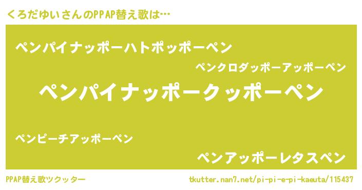 くろだゆいさんのPPAP替え歌は… 『ペンパイナッポークッポーペン』『ペンパイナッポーハトポッポーペン』『ペンアッポーレタスペン』 ツクッター #PPAP替え歌ツクッター http://tkutter.nan7.net/pi-pi-e-pi-kaeuta/115437/