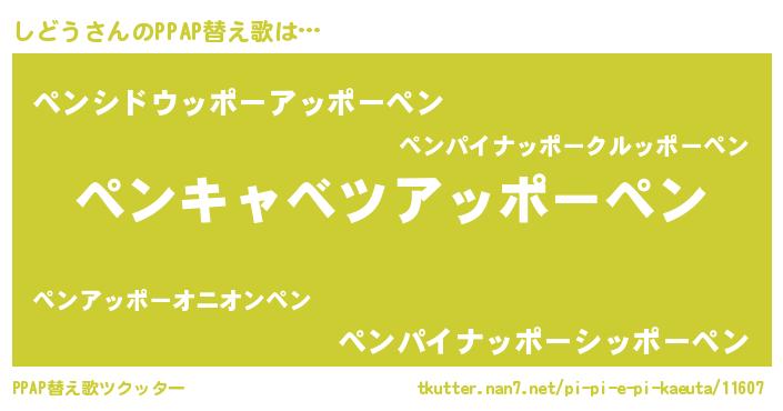 しどうさんのPPAP替え歌は… 『ペンキャベツアッポーペン』『ペンシドウッポーアッポーペン』『ペンパイナッポーシッポーペン』 ツクッター #PPAP替え歌ツクッター http://tkutter.nan7.net/pi-pi-e-pi-kaeuta/11607/