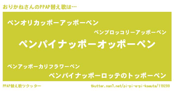 おりかねさんのPPAP替え歌は… 『ペンパイナッポーオッポーペン』『ペンオリカッポーアッポーペン』『ペンパイナッポーロッテのトッポーペン』 ツクッター #PPAP替え歌ツクッター http://tkutter.nan7.net/pi-pi-e-pi-kaeuta/119299/