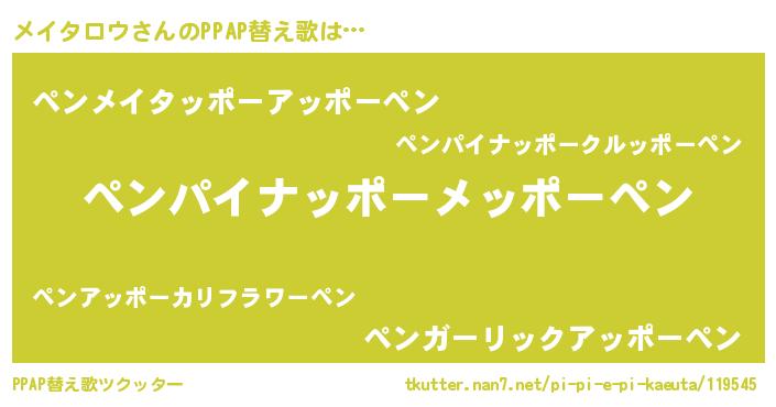 | ヘコむあだ名 | 『メイタロウ(小並感)』『メイぷりん』 |