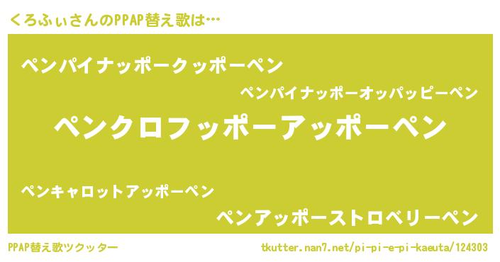 くろふぃさんのPPAP替え歌は… 『ペンクロフッポーアッポーペン』『ペンパイナッポークッポーペン』『ペンアッポーストロベリーペン』 ツクッター #PPAP替え歌ツクッター http://tkutter.nan7.net/pi-pi-e-pi-kaeuta/124303/