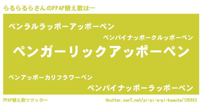 | 意味不明あだ名 | 『自称らるらるら』『ペロリンらるらるら』 |