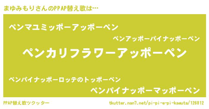まゆみもりさんのPPAP替え歌は… 『ペンカリフラワーアッポーペン』『ペンマユミッポーアッポーペン』『ペンパイナッポーマッポーペン』 ツクッター #PPAP替え歌ツクッター http://tkutter.nan7.net/pi-pi-e-pi-kaeuta/126812/
