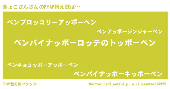 | 意味不明あだ名 | 『自称きょこさん』『ペロリンきょこさん』 |