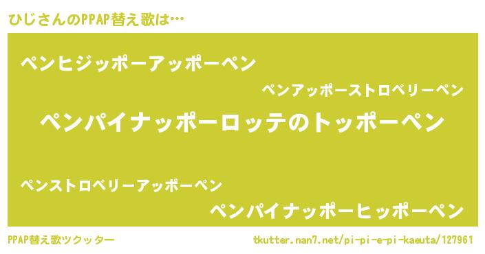 ひじさんのPPAP替え歌は… 『ペンパイナッポーロッテのトッポーペン』『ペンヒジッポーアッポーペン』『ペンパイナッポーヒッポーペン』 ツクッター #PPAP替え歌ツクッター http://tkutter.nan7.net/pi-pi-e-pi-kaeuta/127961/