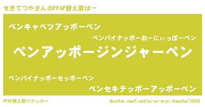 せきてつやさんのPPAP替え歌は… 『ペンアッポージンジャーペン』『ペンキャベツアッポーペン』『ペンセキテッポーアッポーペン』 ツクッター #PPAP替え歌ツクッター http://tkutter.nan7.net/pi-pi-e-pi-kaeuta/12836/