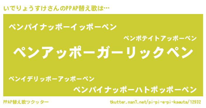 いでりょうすけさんのPPAP替え歌は… 『ペンアッポーガーリックペン』『ペンパイナッポーイッポーペン』『ペンパイナッポーハトポッポーペン』 ツクッター #PPAP替え歌ツクッター http://tkutter.nan7.net/pi-pi-e-pi-kaeuta/12932/