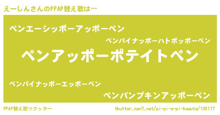 えーしんさんのPPAP替え歌は… 『ペンアッポーポテイトペン』『ペンエーシッポーアッポーペン』『ペンパンプキンアッポーペン』 ツクッター #PPAP替え歌ツクッター http://tkutter.nan7.net/pi-pi-e-pi-kaeuta/130117/