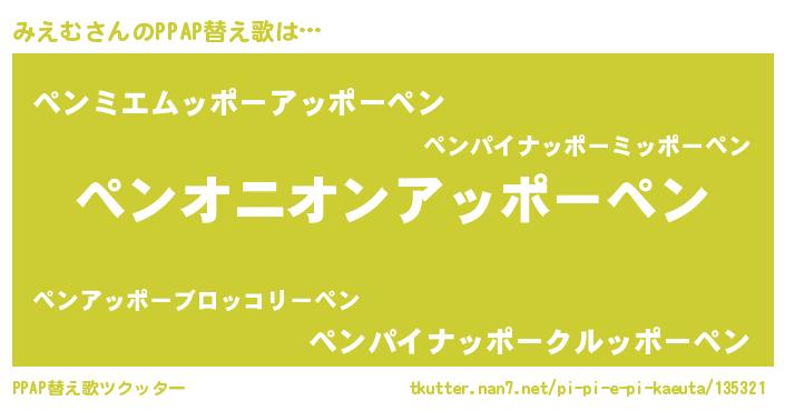 | ピコ太郎風あだ名 | 『ミコ六郎』『ミエ三郎』『ミミ太郎』 |