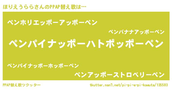 ほりえうららさんのPPAP替え歌は… 『ペンパイナッポーハトポッポーペン』『ペンホリエッポーアッポーペン』『ペンアッポーストロベリーペン』 ツクッター #PPAP替え歌ツクッター http://tkutter.nan7.net/pi-pi-e-pi-kaeuta/135583/