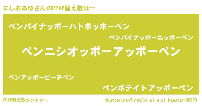 | 肩書あだ名 | 『にしおあゆ大将』『にしおあゆ閣下』 |