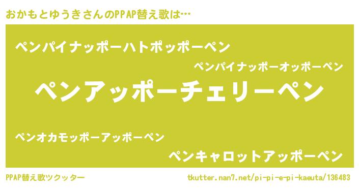 おかもとゆうきさんのPPAP替え歌は… 『ペンアッポーチェリーペン』『ペンパイナッポーハトポッポーペン』『ペンキャロットアッポーペン』 ツクッター #PPAP替え歌ツクッター http://tkutter.nan7.net/pi-pi-e-pi-kaeuta/136483/