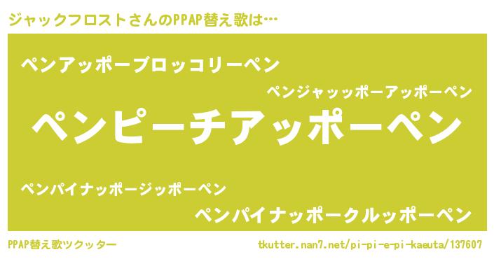 ジャックフロストさんのPPAP替え歌は… 『ペンピーチアッポーペン』『ペンアッポーブロッコリーペン』『ペンパイナッポークルッポーペン』 ツクッター #PPAP替え歌ツクッター http://tkutter.nan7.net/pi-pi-e-pi-kaeuta/137607/