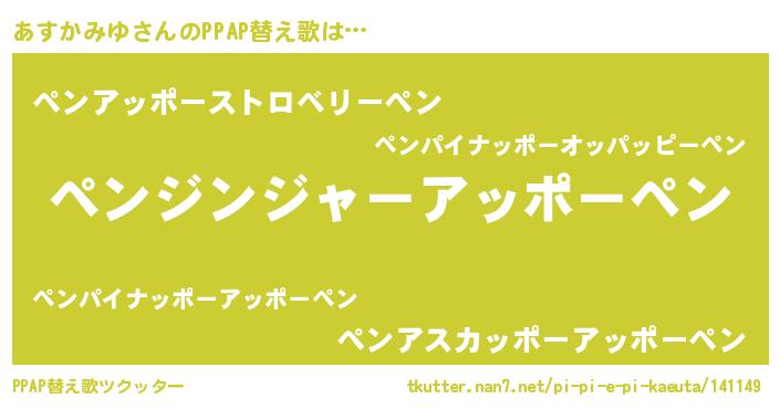 あすかみゆさんのPPAP替え歌は… 『ペンジンジャーアッポーペン』『ペンアッポーストロベリーペン』『ペンアスカッポーアッポーペン』 ツクッター #PPAP替え歌ツクッター http://tkutter.nan7.net/pi-pi-e-pi-kaeuta/141149/