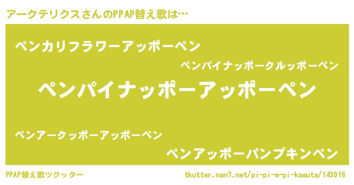 アークテリクスさんのPPAP替え歌は… 『ペンパイナッポーアッポーペン』『ペンカリフラワーアッポーペン』『ペンアッポーパンプキンペン』 ツクッター #PPAP替え歌ツクッター http://tkutter.nan7.net/pi-pi-e-pi-kaeuta/143016/