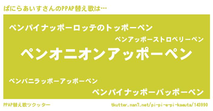 ばにらあいすさんのPPAP替え歌は… 『ペンオニオンアッポーペン』『ペンパイナッポーロッテのトッポーペン』『ペンパイナッポーバッポーペン』 ツクッター #PPAP替え歌ツクッター http://tkutter.nan7.net/pi-pi-e-pi-kaeuta/143990/