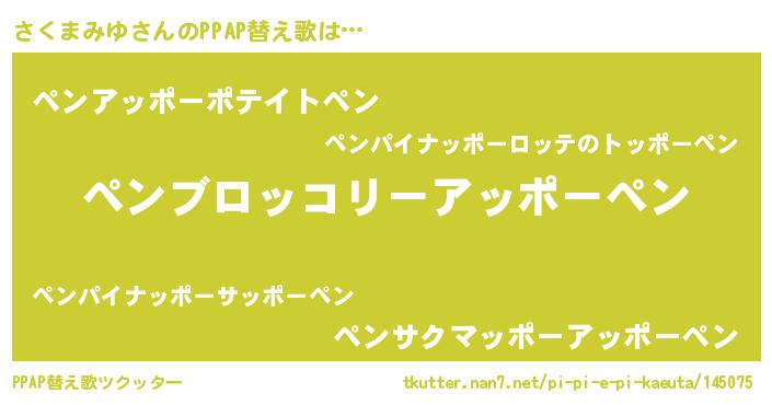 さくまみゆさんのPPAP替え歌は… 『ペンブロッコリーアッポーペン』『ペンアッポーポテイトペン』『ペンサクマッポーアッポーペン』 ツクッター #PPAP替え歌ツクッター http://tkutter.nan7.net/pi-pi-e-pi-kaeuta/145075/