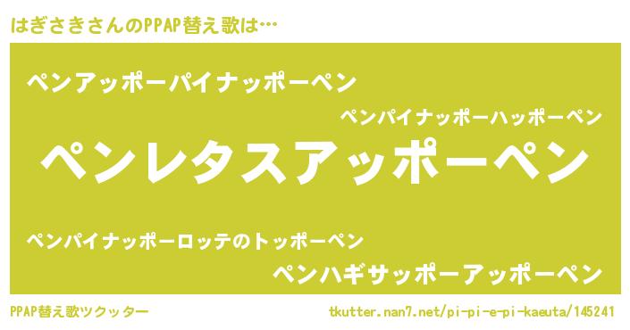 はぎさきさんのPPAP替え歌は… 『ペンレタスアッポーペン』『ペンアッポーパイナッポーペン』『ペンハギサッポーアッポーペン』 ツクッター #PPAP替え歌ツクッター http://tkutter.nan7.net/pi-pi-e-pi-kaeuta/145241/