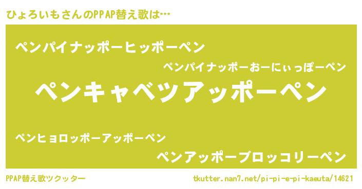 ひょろいもさんのPPAP替え歌は… 『ペンキャベツアッポーペン』『ペンパイナッポーヒッポーペン』『ペンアッポーブロッコリーペン』 ツクッター #PPAP替え歌ツクッター http://tkutter.nan7.net/pi-pi-e-pi-kaeuta/14621/