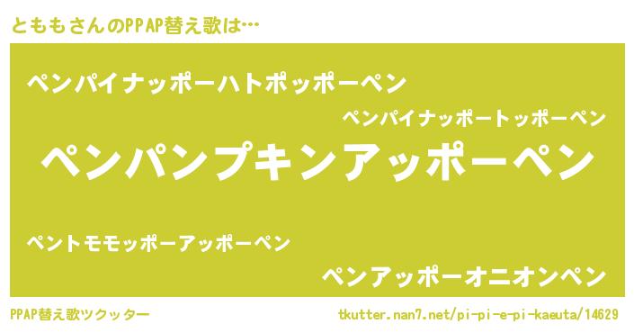 とももさんのPPAP替え歌は… 『ペンパンプキンアッポーペン』『ペンパイナッポーハトポッポーペン』『ペンアッポーオニオンペン』 ツクッター #PPAP替え歌ツクッター http://tkutter.nan7.net/pi-pi-e-pi-kaeuta/14629/