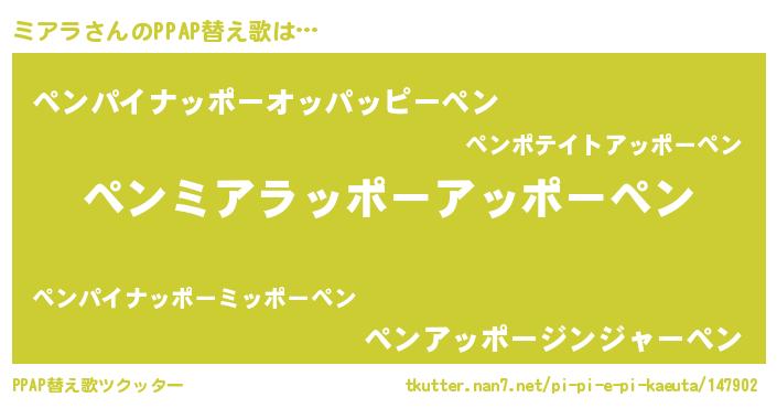 | ピコ太郎風あだ名 | 『ミア五郎』『ミミ太郎』『ピミ六郎』 |