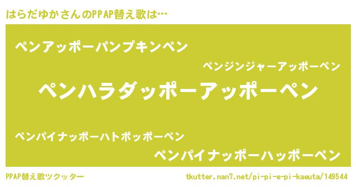 | 男性向けラノベタイトル風あだ名 | 『Re:はらだゆかから始める異世界生活』 |
