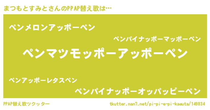 まつもとすみとさんのPPAP替え歌は… 『ペンマツモッポーアッポーペン』『ペンメロンアッポーペン』『ペンパイナッポーオッパッピーペン』 ツクッター #PPAP替え歌ツクッター http://tkutter.nan7.net/pi-pi-e-pi-kaeuta/149834/