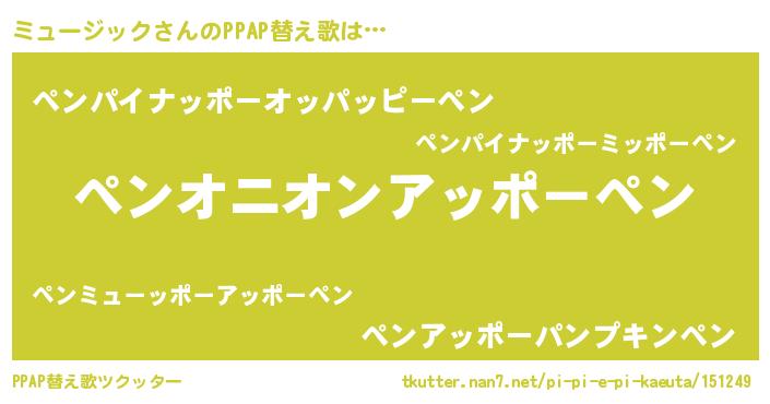 ミュージックさんのPPAP替え歌は… 『ペンオニオンアッポーペン』『ペンパイナッポーオッパッピーペン』『ペンアッポーパンプキンペン』 ツクッター #PPAP替え歌ツクッター http://tkutter.nan7.net/pi-pi-e-pi-kaeuta/151249/