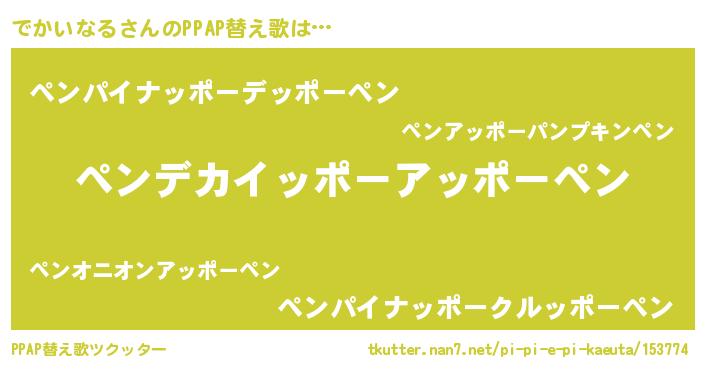 でかいなるさんのPPAP替え歌は… 『ペンデカイッポーアッポーペン』『ペンパイナッポーデッポーペン』『ペンパイナッポークルッポーペン』 ツクッター #PPAP替え歌ツクッター http://tkutter.nan7.net/pi-pi-e-pi-kaeuta/153774/