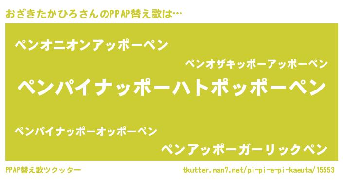 おざきたかひろさんのPPAP替え歌は… 『ペンパイナッポーハトポッポーペン』『ペンオニオンアッポーペン』『ペンアッポーガーリックペン』 ツクッター #PPAP替え歌ツクッター http://tkutter.nan7.net/pi-pi-e-pi-kaeuta/15553/